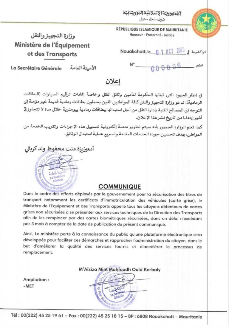 دعت وزارة التجهيز والنقل كافة المواطنين الذين يحملون بطاقات رمادية(ملكية) قديمة غير مؤمنة إلى التوجه إلى المصالح الفنية بإدارة النقل لاستبدالها ببطاقات رمادية بيومترية.