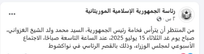 وكشفت الرئاسة الموريتانية عبر صفحتها في فيسبوك عن تقديم الموعد الأسبوعي لمجلس الوزراء إلى الثلاثاء التاسعة صباحا بدل الأربعاء."