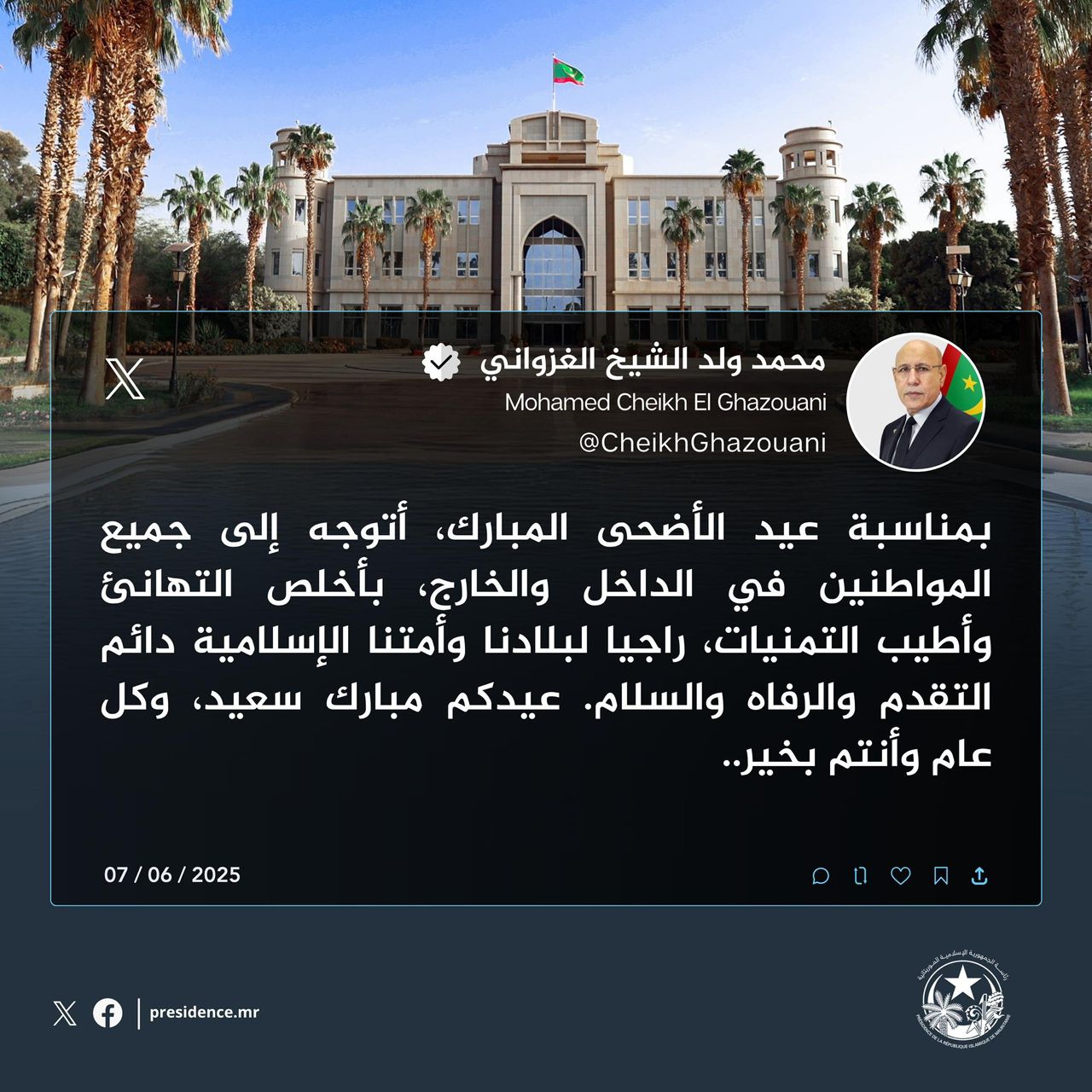 هنأ رئيس الجمهورية، محمد ولد الشيخ الغزواني، جميع المواطنين في الداخل والخارج، بمناسبة حلول عيد الأضحى المبارك، معبرًا في تغريدة عبر منصة إكس مساء اليوم، عن خالص التهانئ وأطيب التمنيات بدوام التقدم والرفاه والسلام.