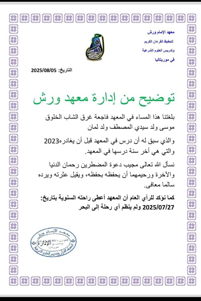 وكان الشاب قد غرق فى شاطئ نواكشوط يوم امس امام انظار الموجودين للاستجمام على الشاطئ.