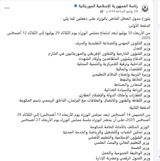 وكتبت صفحة الرئاسة في المنشور حينها أن الدفعة الثانية من الحكومة تبدأ عطلتها "من الخميس 14 أغسطس (بعد مجلس الوزراء يوم الأربعاء 13 أغسطس) إلى الثلاثاء 26 أغسطس 2025، على أن يحضر الوزراء جلسة مجلس الوزراء يوم الأربعاء 27 أغسطس".