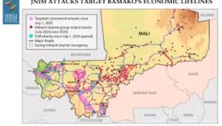 تحوّل الطرق القادمة من Kayes – خاي (14.45°N, -11.44°W) غربا، ومن Ségou – سيغو (13.44°N, -6.26°W) وSan – سان (13.30°N, -4.90°W) في الوسط، ومن Sikasso – سيكاسو (11.32°N, -5.66°W) وBougouni – بوغوني (11.42°N, -7.48°W) جنوباً، إلى عقد اختناق اقتصادي تُدار حولها المعركة ببرودة أعصاب