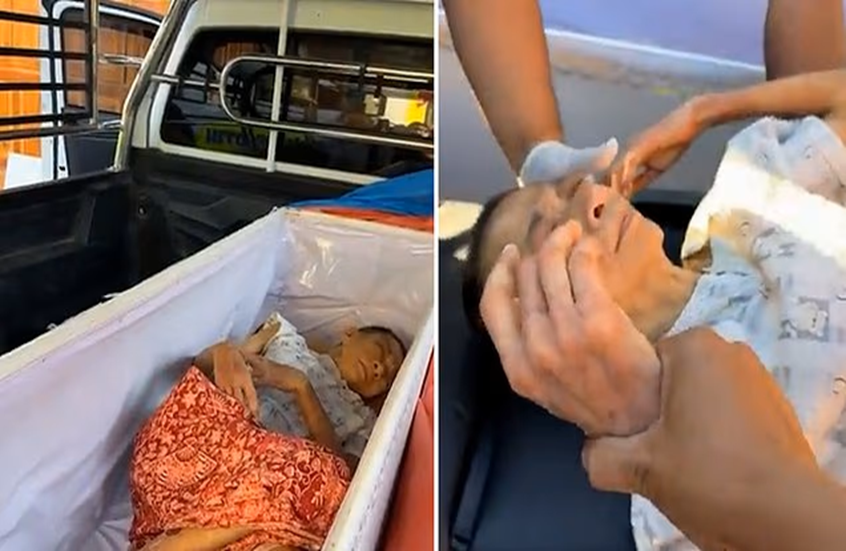 "واستيقظت تشونثيروت البالغة من العمر 65 عاما فجأة، وبدأت تدق بيدها على غطاء النعش، فيما كانت عائلتها تستعد لمراسم الجنازة. وتظهر لقطات مصورة المرأة الضعيفة وهي تتحرك داخل التابوت، وتحاول إبعاد الذباب عن وجهها، بينما كان أفراد عائلتها واقفين في ذهول لا يصدقون ما يرون.