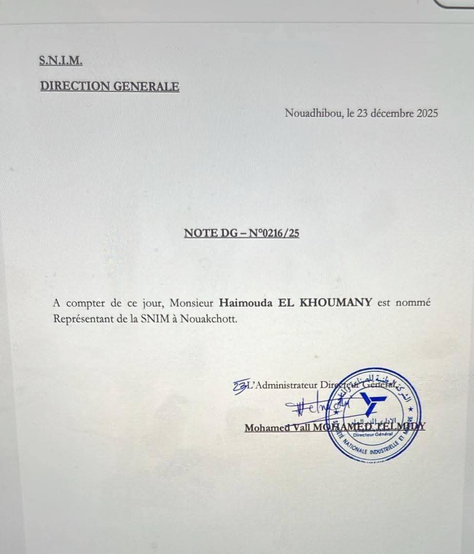 "كما أعلنت "اسنيم" عن تعيين الإطار المتميز حيمودة ولد الخوماني ممثلاً لمكاتب الشركة بالعاصمة نواكشوط.