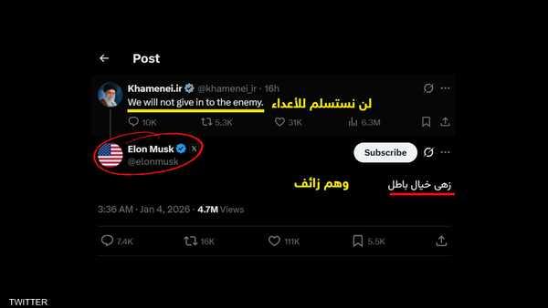"نشر المرشد الإيراني علي خامنئي أمس السبت سلسلة تغريدات باللغة الإنجليزية على حسابه في منصة إكس، تتناول على الأغلب التصريحات الأميركية حول الاحتجاجات الشعبية في إيران، ومن بينها تغريدة لفتت على ما يبدو مالك المنصة إيلون ماسك.