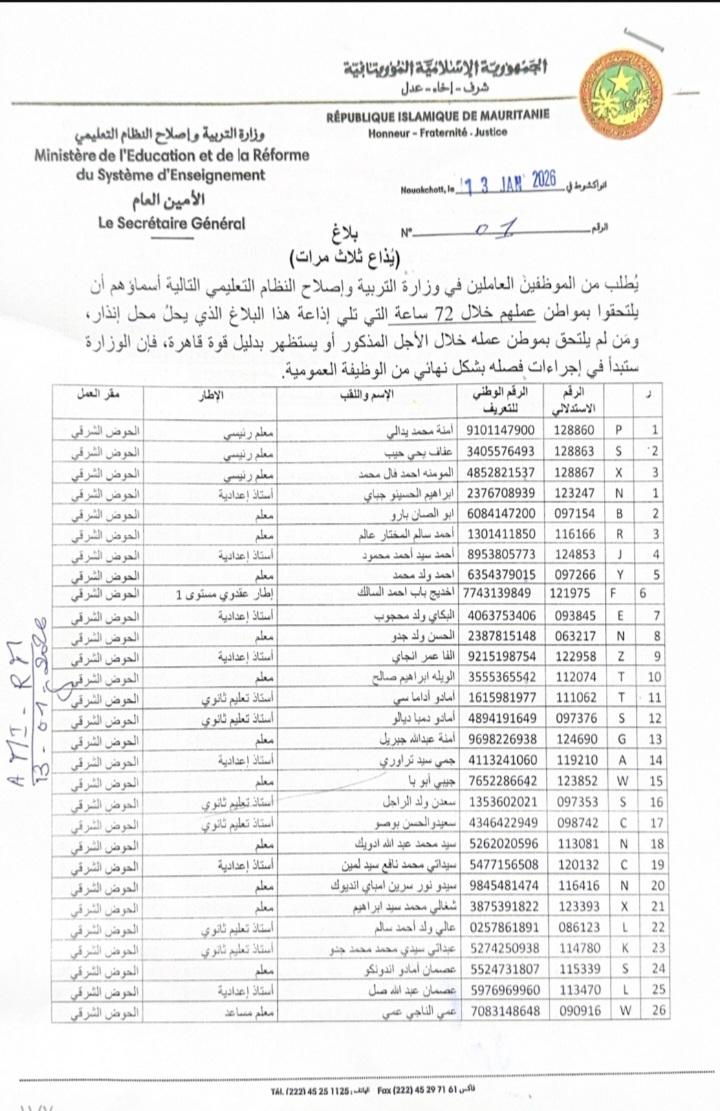 وشمل الإنذار التهديد بالشروع في إجراءات الفصل و وقعه الأمين العام لوزارة التربية يحيى بوب الطالب، والأمين العام لوزارة الثقافة والاعلام والعلاقات مع البرلمان.