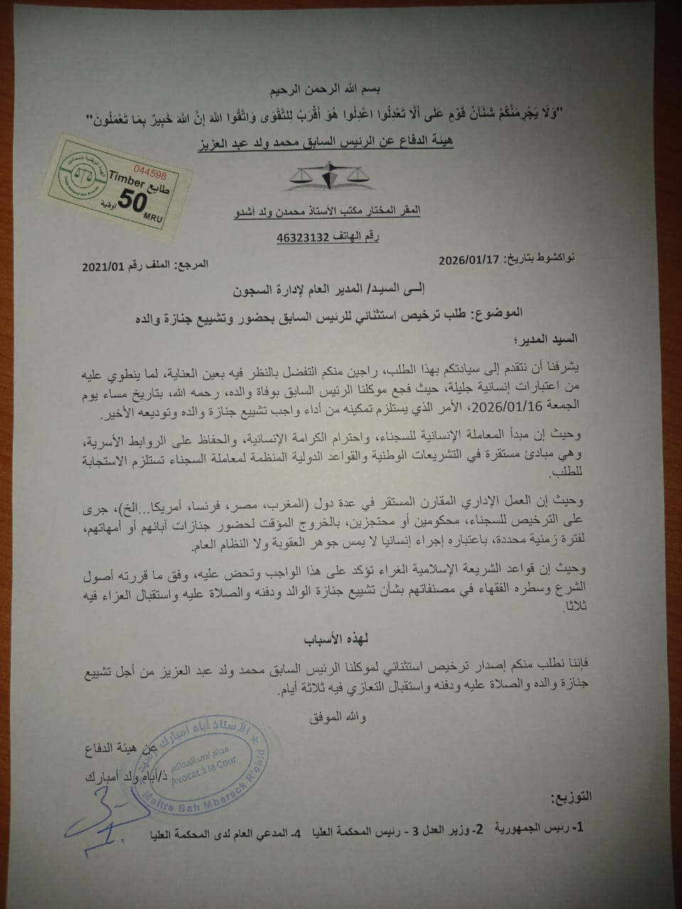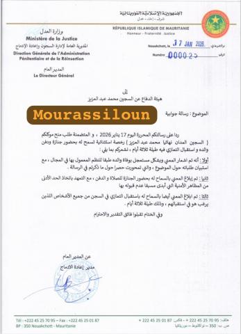 قال محامي الرئيس السابق عبد الرحمن ولد أحمد زروق إن رسالة إدارة السجون الموجهة إلى هيئة دفاع الرئيس السابق محمد ولد عبد العزيز لا تُعد رداً على طلب الهيئة المتعلق بتمكين موكلها من تشييع والده واستقبال التعازي، مؤكداً أنها اقتصرت على سرد العرض الذي قدمته الإدارة لولد عبد العزيز وردّه عليه، دون أي تعاطٍ مباشر مع فريق الدفاع.