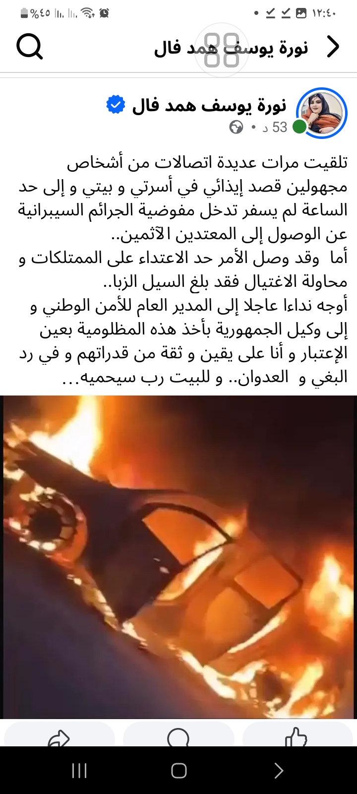 الفنانة نورة بنت يوسف ولد همد فال كتبت التدوينة التالية وأرفقتها بصورة سيارة تشتعل فيها النيران :