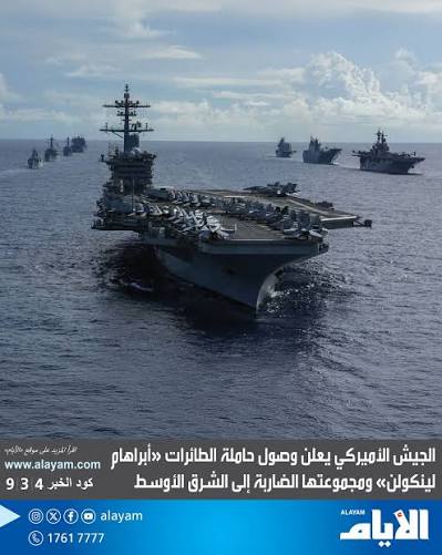 أعلنت القيادة الأميركية الوسطى "سنتكوم" وصول حاملة الطائرات الأميركية "يو إس إس أبراهام لينكولن" والمجموعة الضاربة المرافقة لها إلى منطقة الشرق الأوسط.