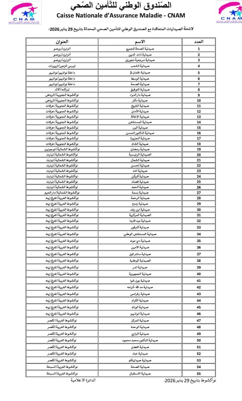 Jan 29 / التعليقات أسماء الصيدليات المعتمدة عند الصندوق الوطني للتأمين الصحي (اكنام) على عموم التراب الوطني خميس, 2026/01/29 - 20:13