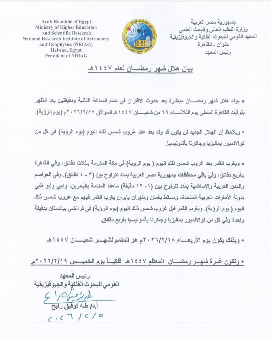 "وبحسب المعهد القومي للبحوث الفلكية والجيوفيزيقية في مصر، فمن المقرر أن يولد هلال شهر رمضان لعام 1447 هجرياً فلكياً عقب الاقتران المركزي في تمام الساعة الثانية ودقيقتين ظهراً بتوقيت القاهرة المحلي يوم الثلاثاء 17 فبراير 2026م (29 شعبان 1447هـ)، الموافق ليوم الرؤية.