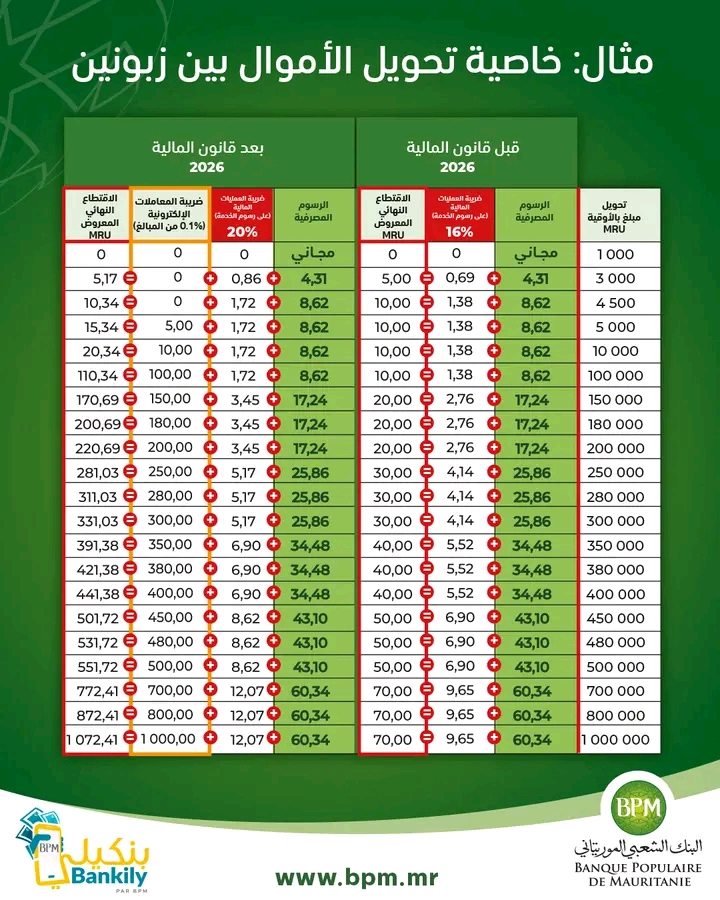 ستلاحظون في الجدول أسفله أننا اعتمدنا خدمة تحويل الأموال كمثال : ضريبة المعاملات الإلكترونية تم تطبيقها على المبالغ التي تساوي أو تفوق 5000 أوقية جديدة. وفي ما يتعلق بضريبة العمليات المالية فقد شهدت ارتفاعا من 16% إلى 20% طبقا لقانون المالية 2026، وهي مطبقة على جميع رسوم الخدمات (التحويل، السحب، جيمتل، تسديد الفواتير…إلخ) بغض النظر عن مبلغ المعاملة.