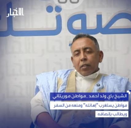 "استغرب المواطن الموريتاني الشيخ باي ولد أحمد ما تعرض له من إهانة ومعاملة غير قانونية من طرف أمن مطار نواكشوط الدوي أم التونسي فجر أمس الأربعاء، ومنعه من السفر رغم أكماله كافة إجراءات المغادرة، مطالبا الجهات المعنية بالتدخل لإنصافه.