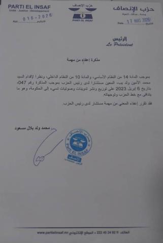 بموجب المادة 14 من النظام الأساسي، والمادة 10 من النظام الداخلي، ونظرًا لإقدام السيد محمد الأمين ولد يب، المعين مستشارًا لدى رئيس الحزب بموجب المذكرة رقم 047 بتاريخ 6 إبريل 2023، على توزيع ونشر تدوينات وتصريحات تسيء إلى الحكومة، وهو ما يتنافى مع خط الحزب وتوجهاته،