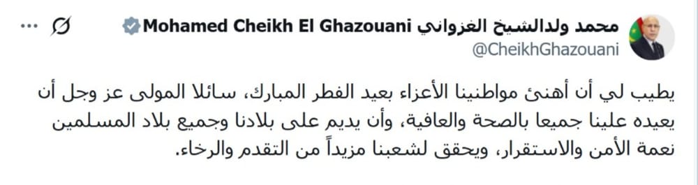 "غرد الرئيس محمد ولد الغزواني عبر حسابه على موقع X مهنئا الموريتانيين بمناسبة حلول عيد الفطر المبارك.
