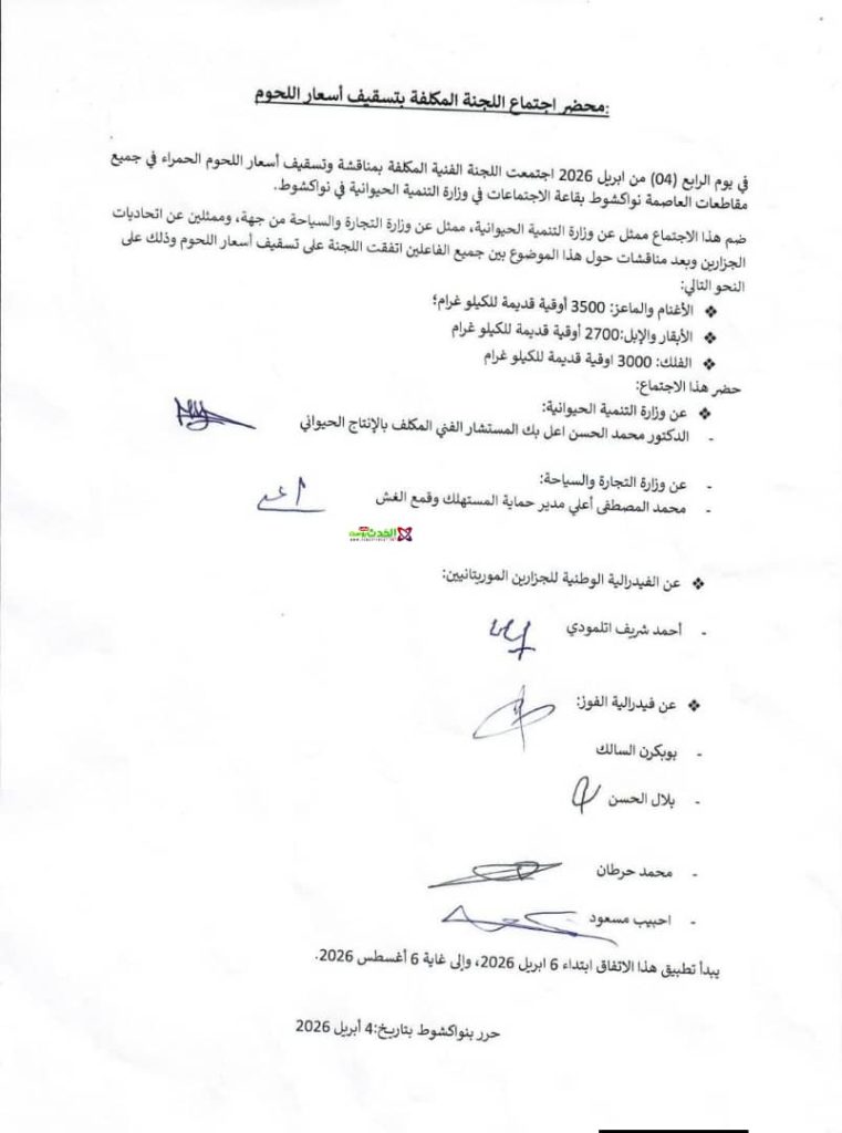 "أعلن زوال امس السبت، في مباني وزارة التنمية الحيوانية بالعاصمة نواكشوط، عن اعتماد تسقيف لأسعار اللحوم الحمراء، سيبدأ العمل به الإثنين 6 إبريل الجاري، ويعتمد مبلغ 3500 أوقية قديمة كسعر ثابت لكيلوغرام لحم الضأن وللماعز ، و 2700 أوقية قديمة لكيلوغرام لحم الإبل والبقر، في حين يحدد 3000 أوقية قديمة كسعر لكلوغرام الفلكه.
