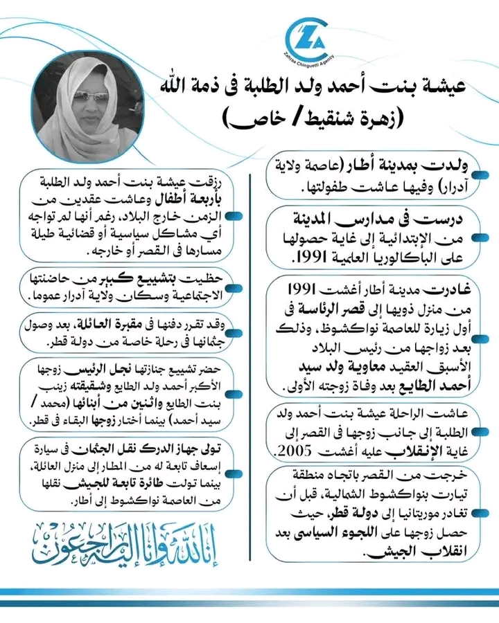 "أعلن يوم الثلاثاء الماضي عن وفاة السيدة عائشة بنت أحمد الطلبة، زوجة الرئيس الموريتاني الأسبق معاوية ولد سيد أحمد الطائع، وذلك بعد معاناة مع المرض.