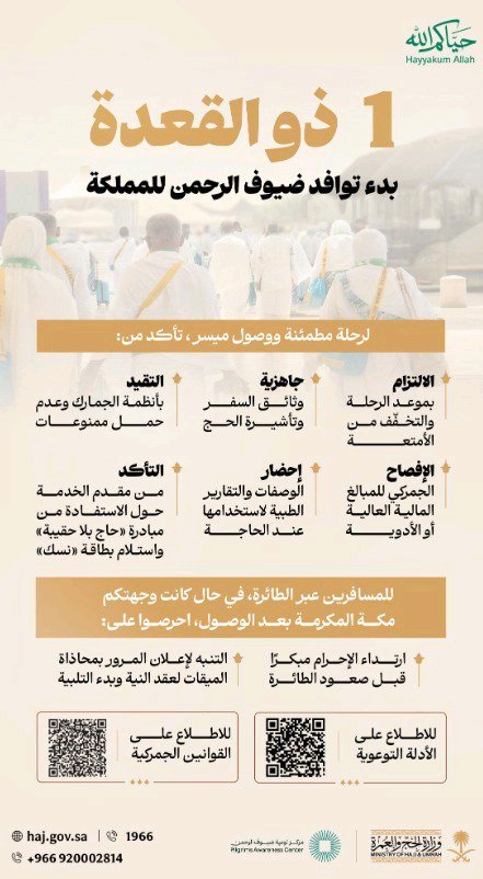 وفي هذا السياق، أعلنت وزارة الحج والعمرة السعودية، عبر حسابها الرسمي على منصة «إكس»، حزمة من الضوابط والإرشادات الهامة التي يجب على جميع الحجاج الالتزام بها قبل القدوم إلى أراضي المملكة.