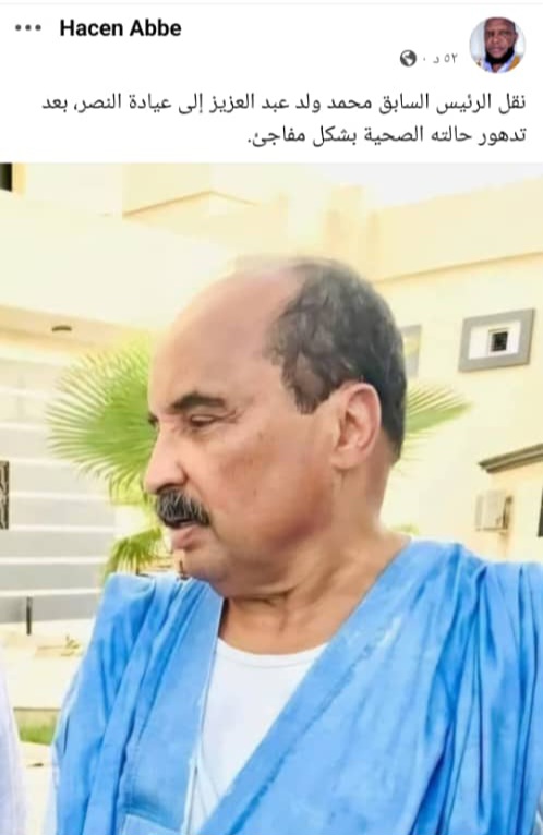 May 31 / التعليقات نقل ولد عبد العزيز الى عيادة النصر بعد تدهور صحته أفادت مصادر متطابقة اليوم السبت الموافق: 2025/5/31 أن الحالة الصحية للرئيس السابق السيد محمد ولد عبد العزيز تدهورت بشكل مفاجئ. سبت, 2025/05/31 - 13:29